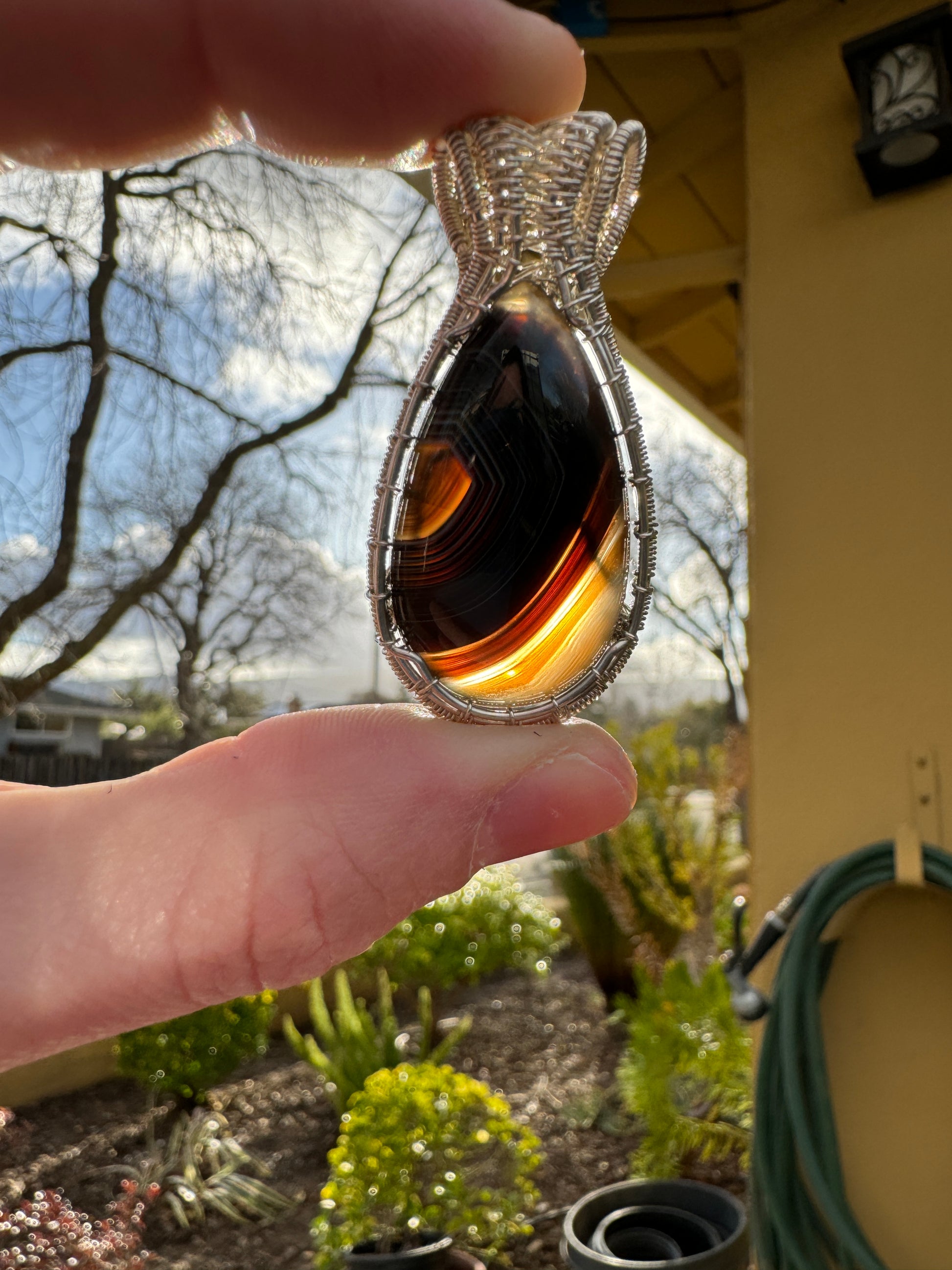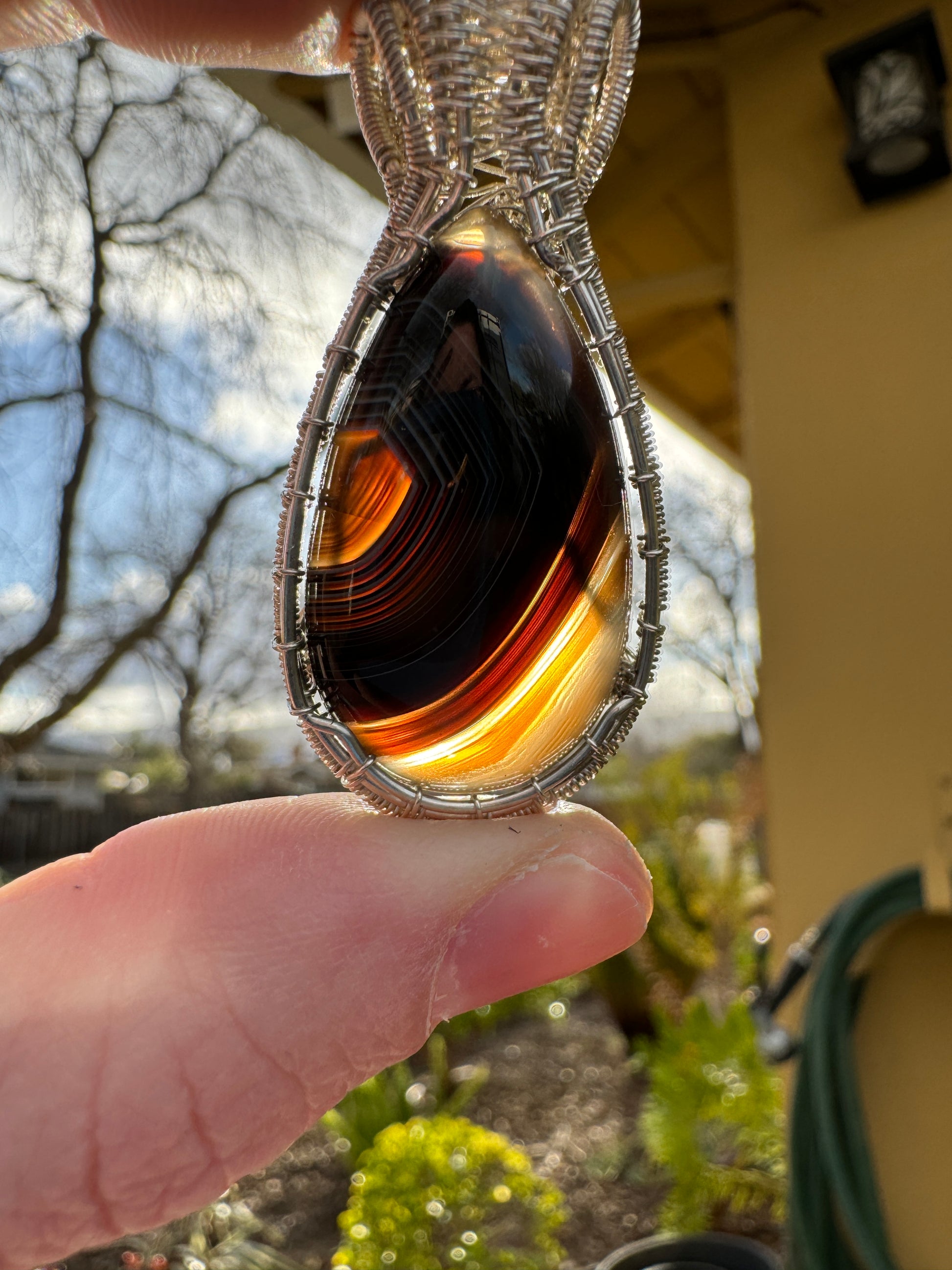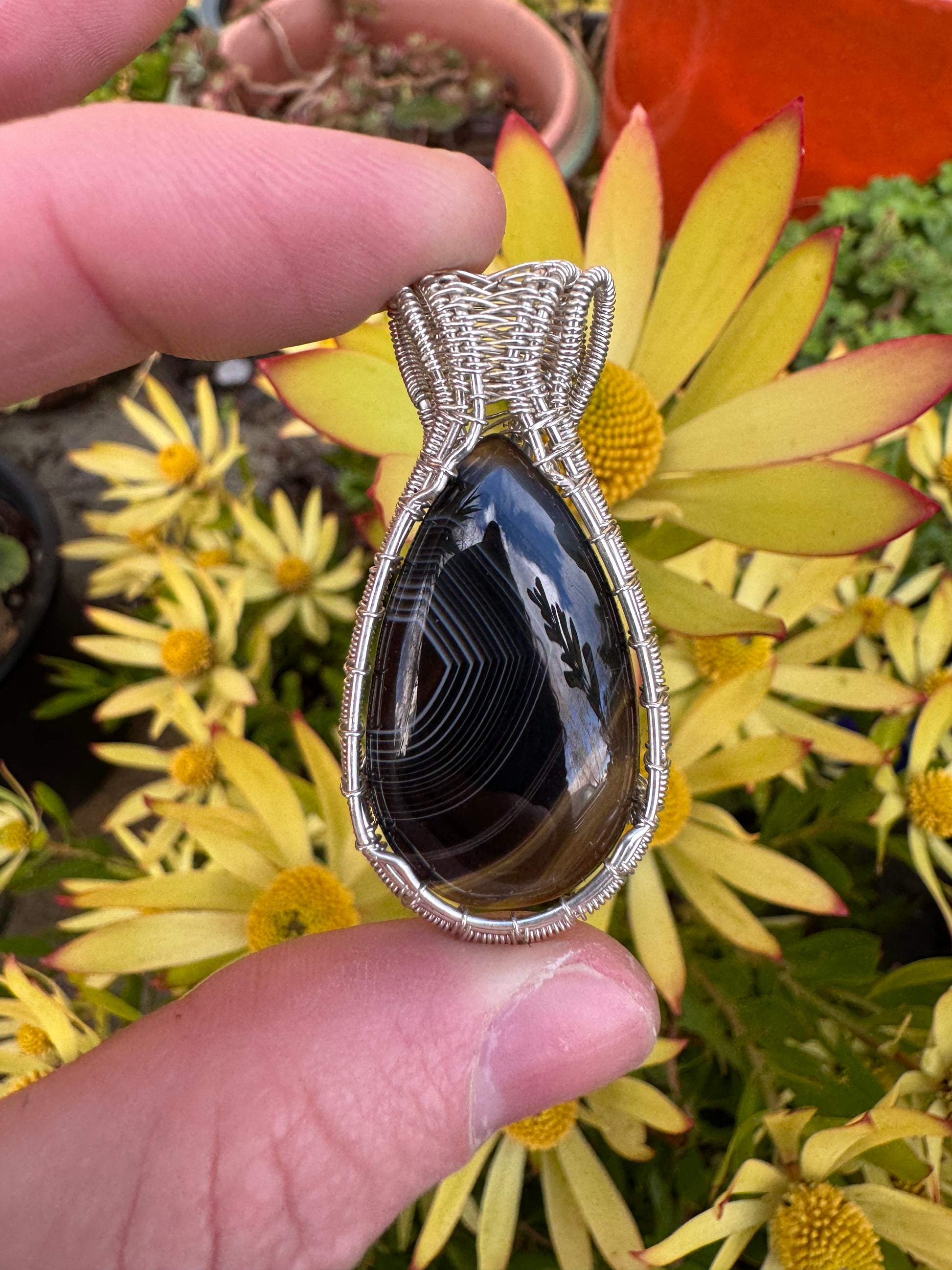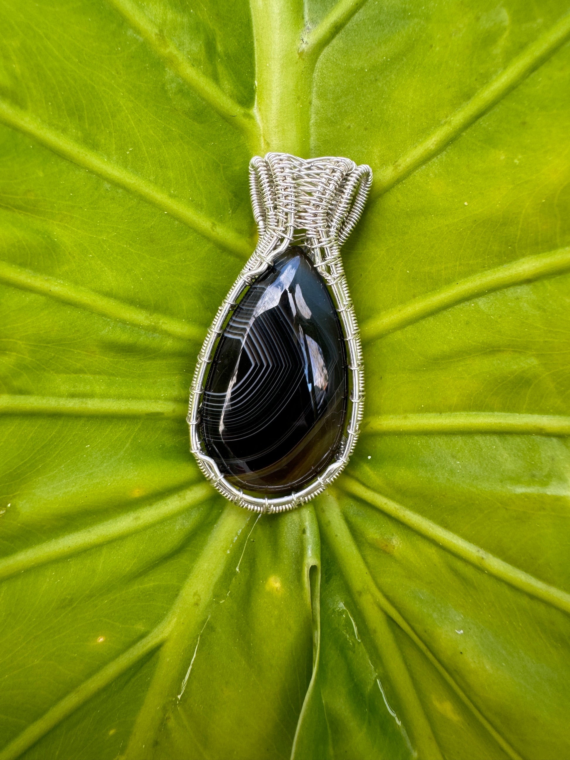 Step into the mysterious elegance of our Black Banded Agate Aura – a captivating fusion of dark allure and sterling silver sophistication, intricately wrapped by the talented hands of Or Barniv