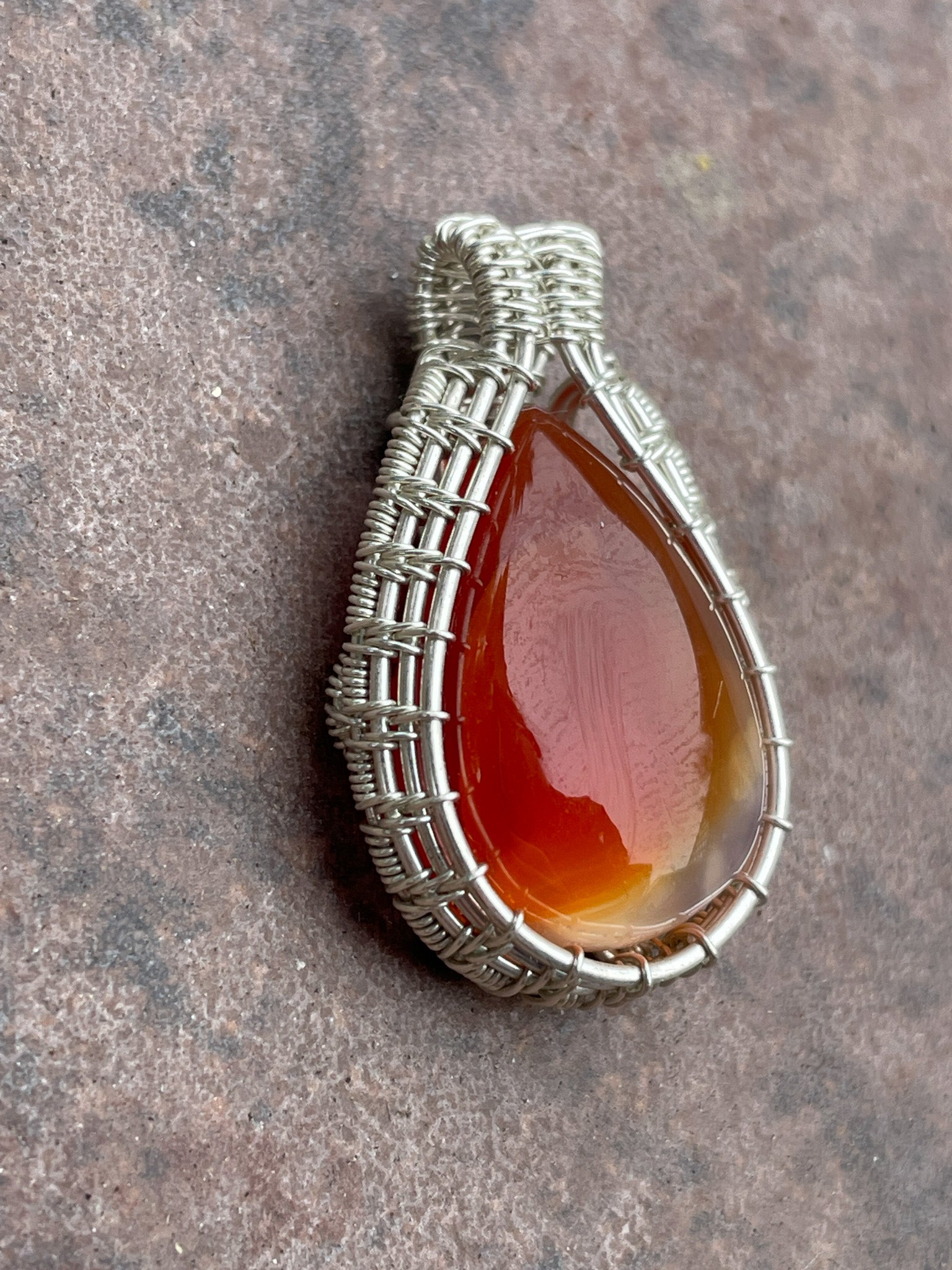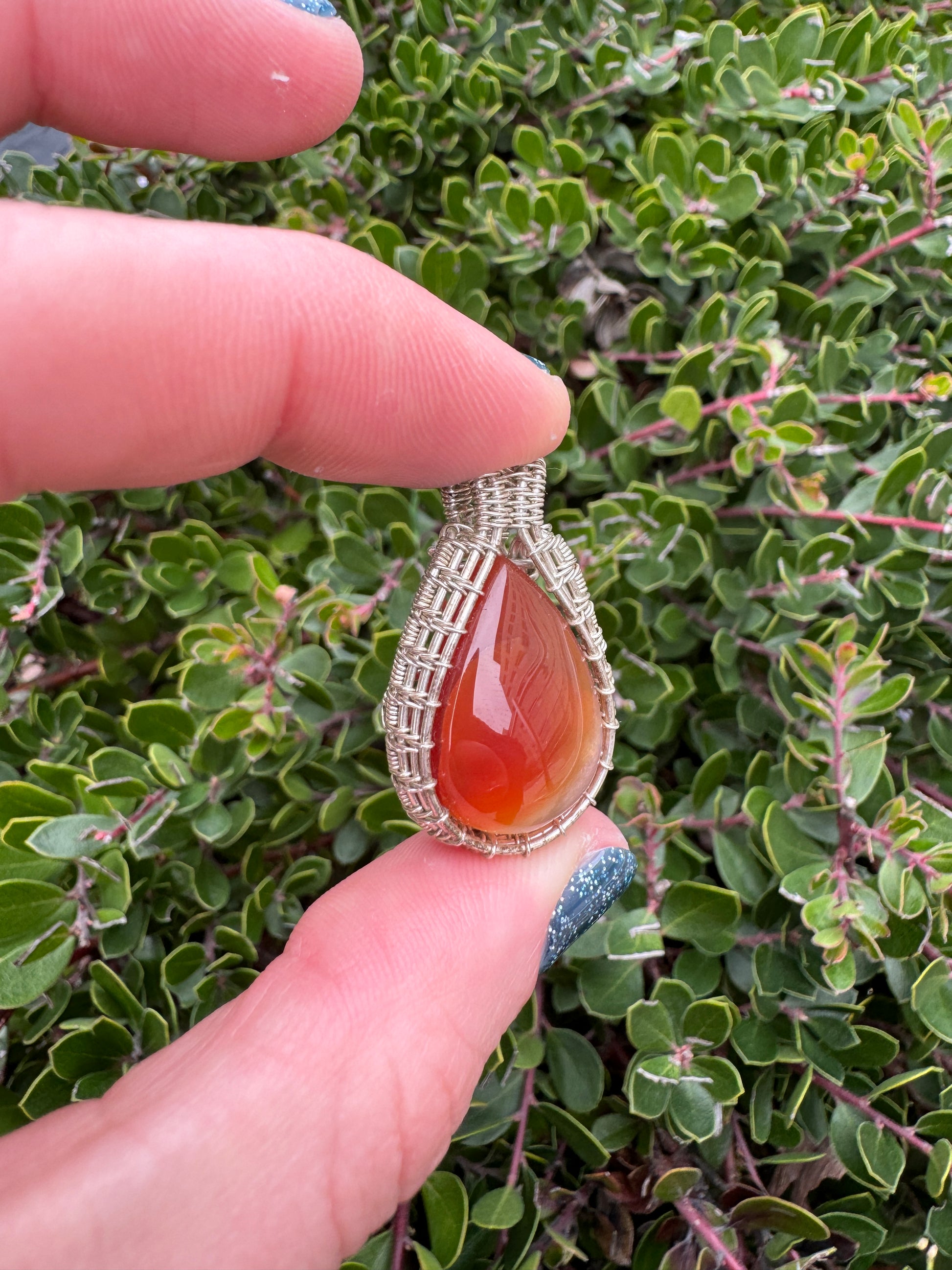 Behold the radiance of our Carnelian Elegance— a captivating fusion of nature's vibrancy and sterling silver sophistication. This unique pendant, skillfully handcrafted marries the warmth of Carnelian with the cool elegance of sterling silver wrapping.