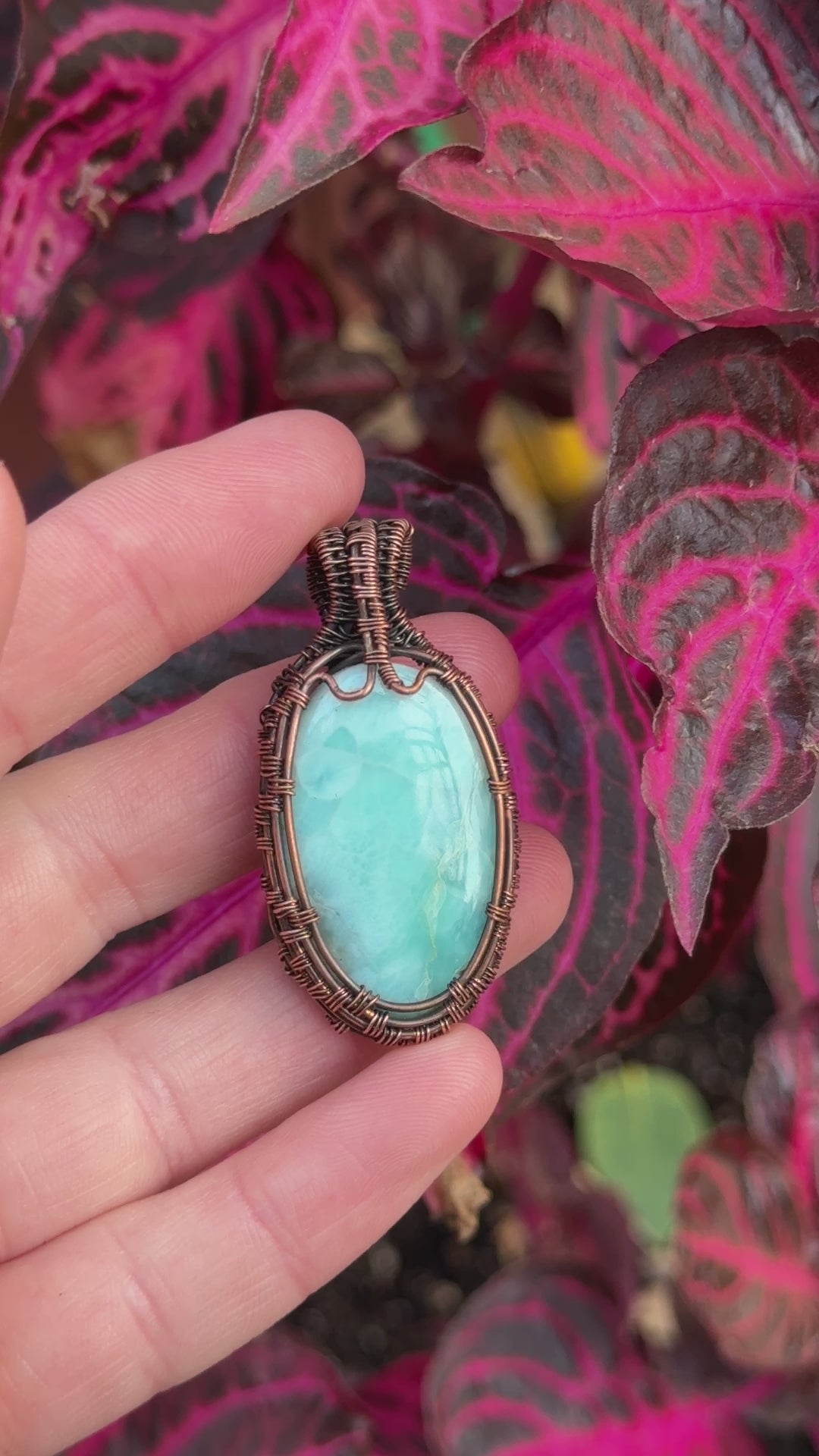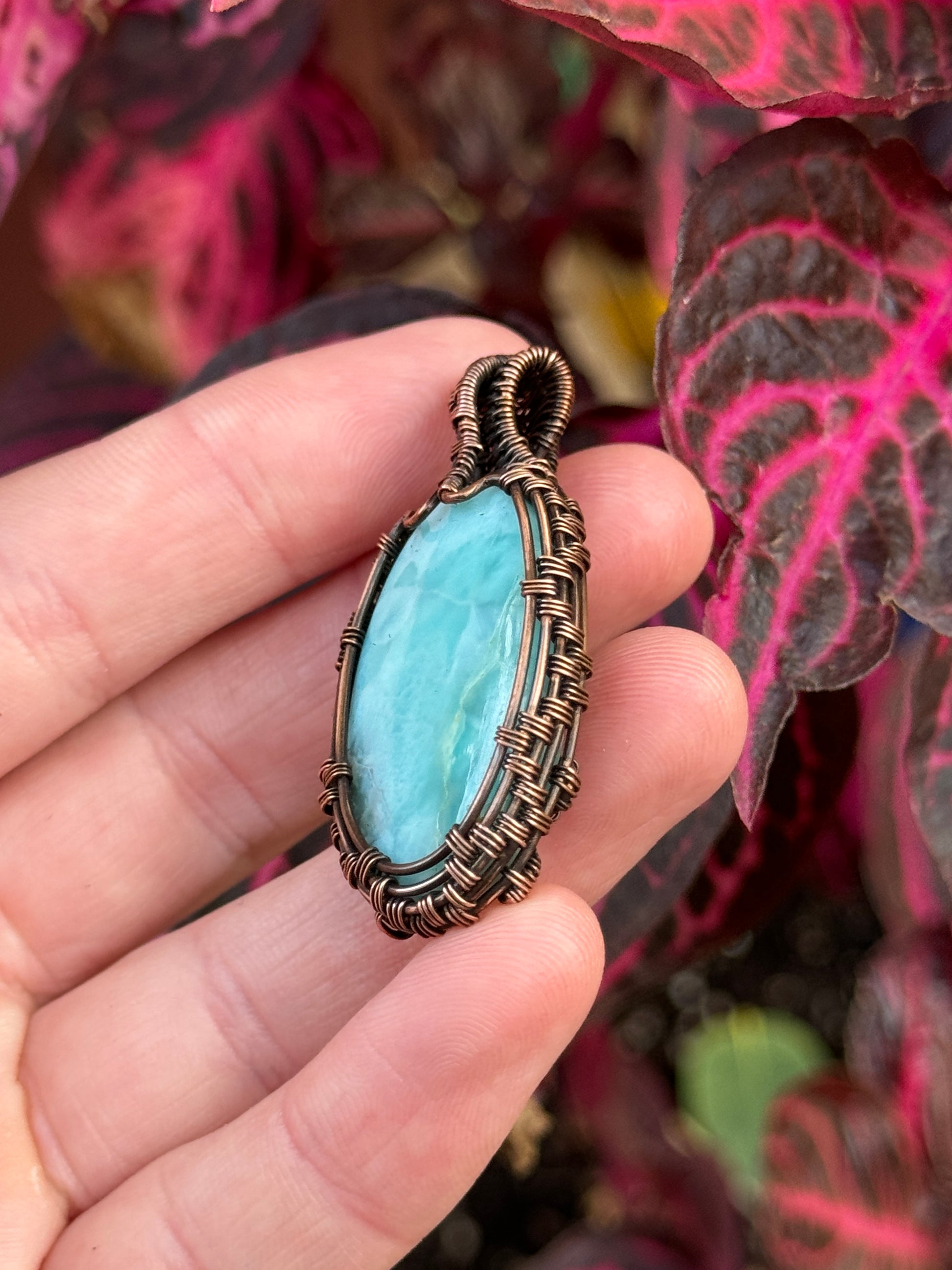 The warm copper wire wrapping beautifully frames the larimar, creating a harmonious contrast that highlights its natural allure. Each pendant is carefully handcrafted to ensure every piece is unique.