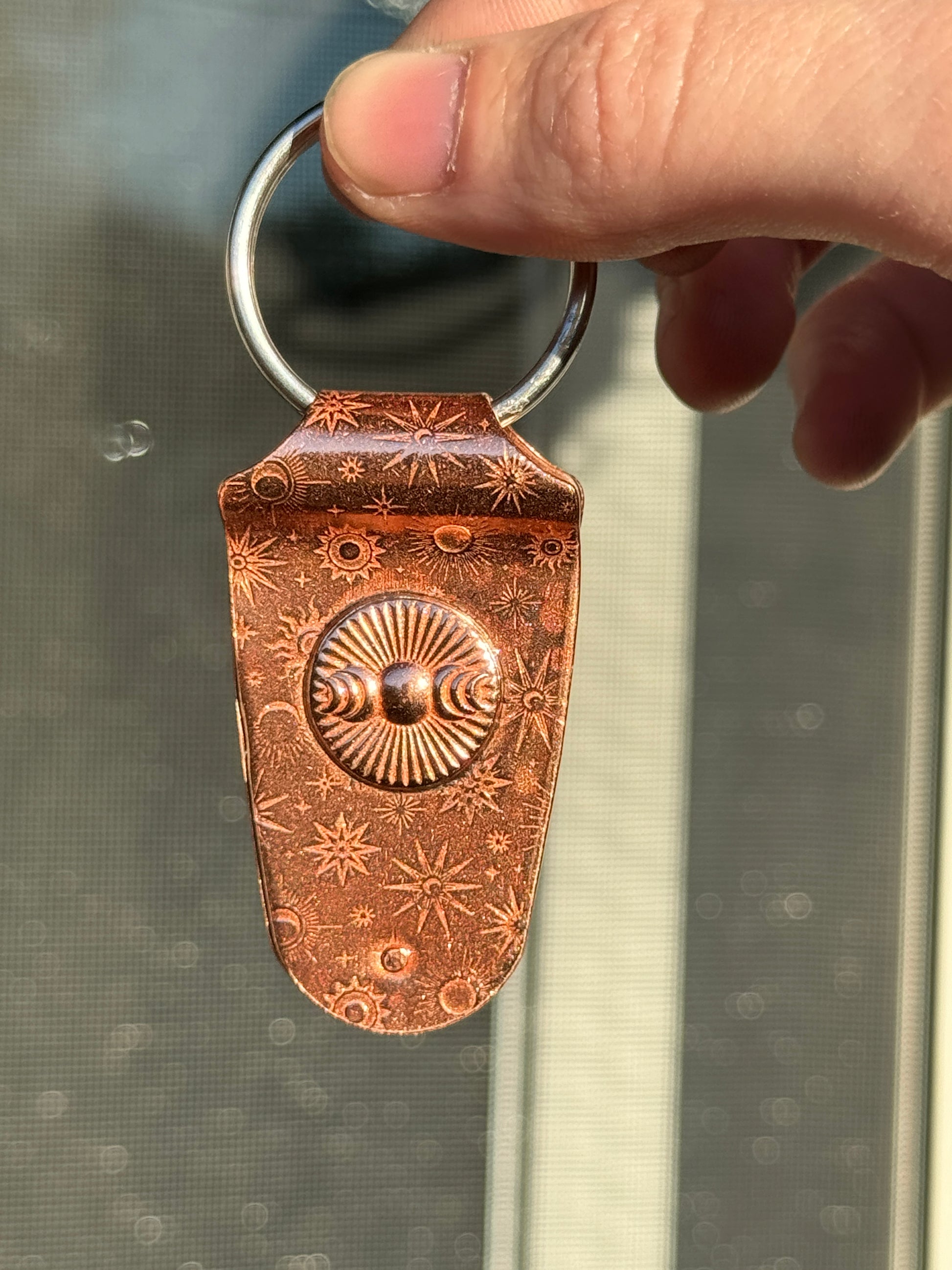 Carry the quiet magic of the moonlit sky with the Midnight Luna Keychain. Handcrafted from copper, it features a celestial design that highlights the elegance of the moon surrounded by shimmering stars, creating a sense of mystery and wonder.