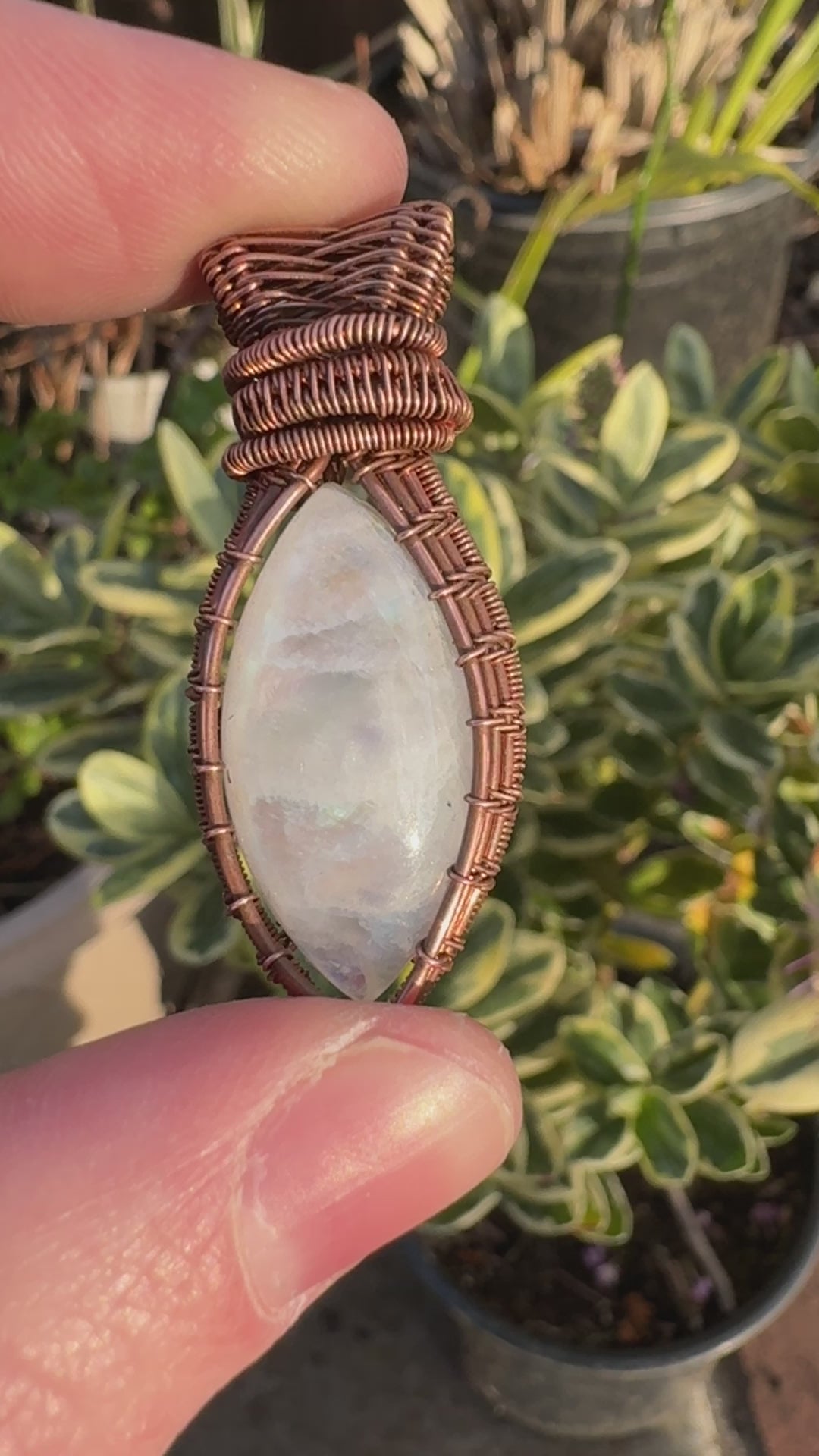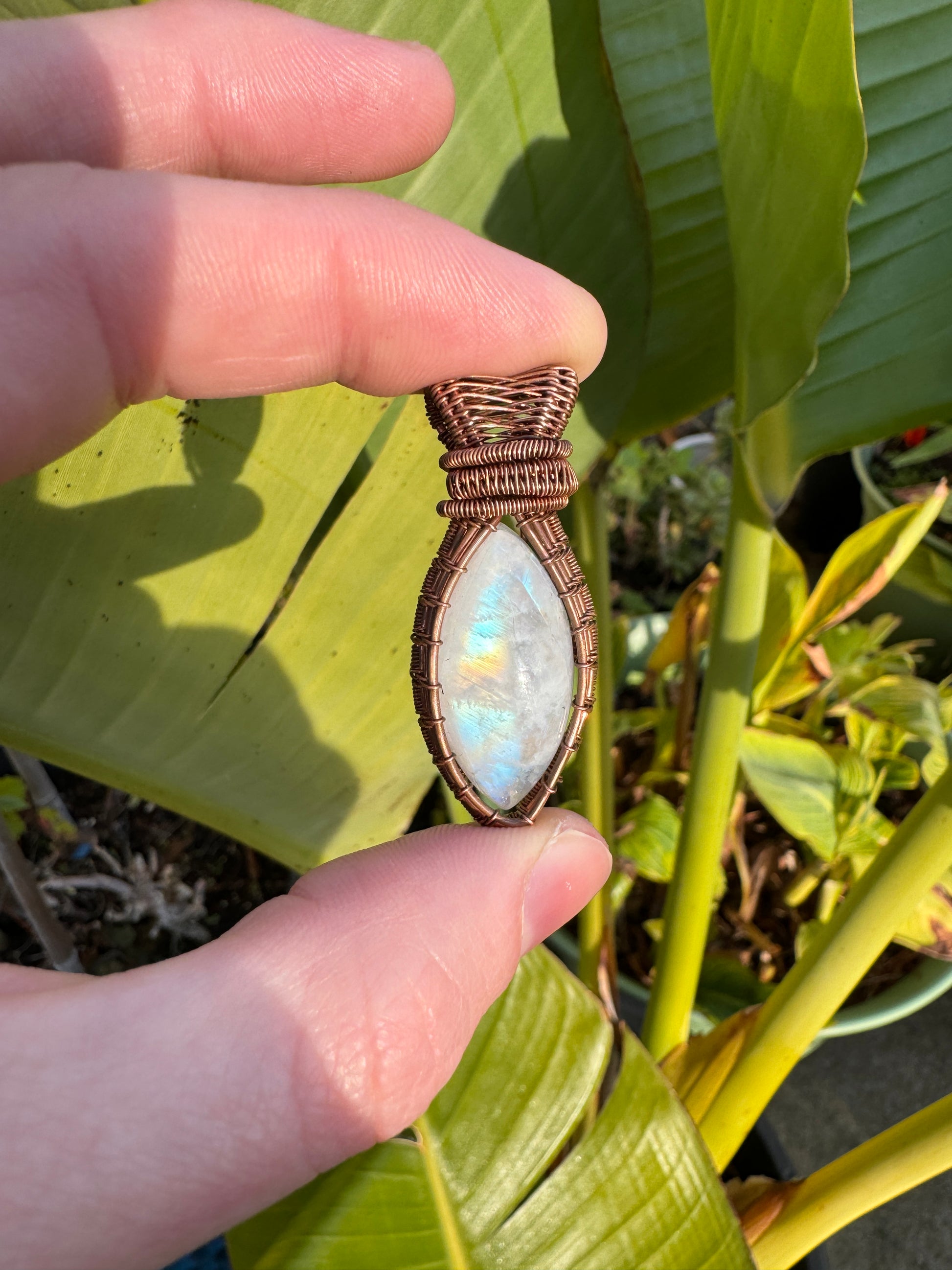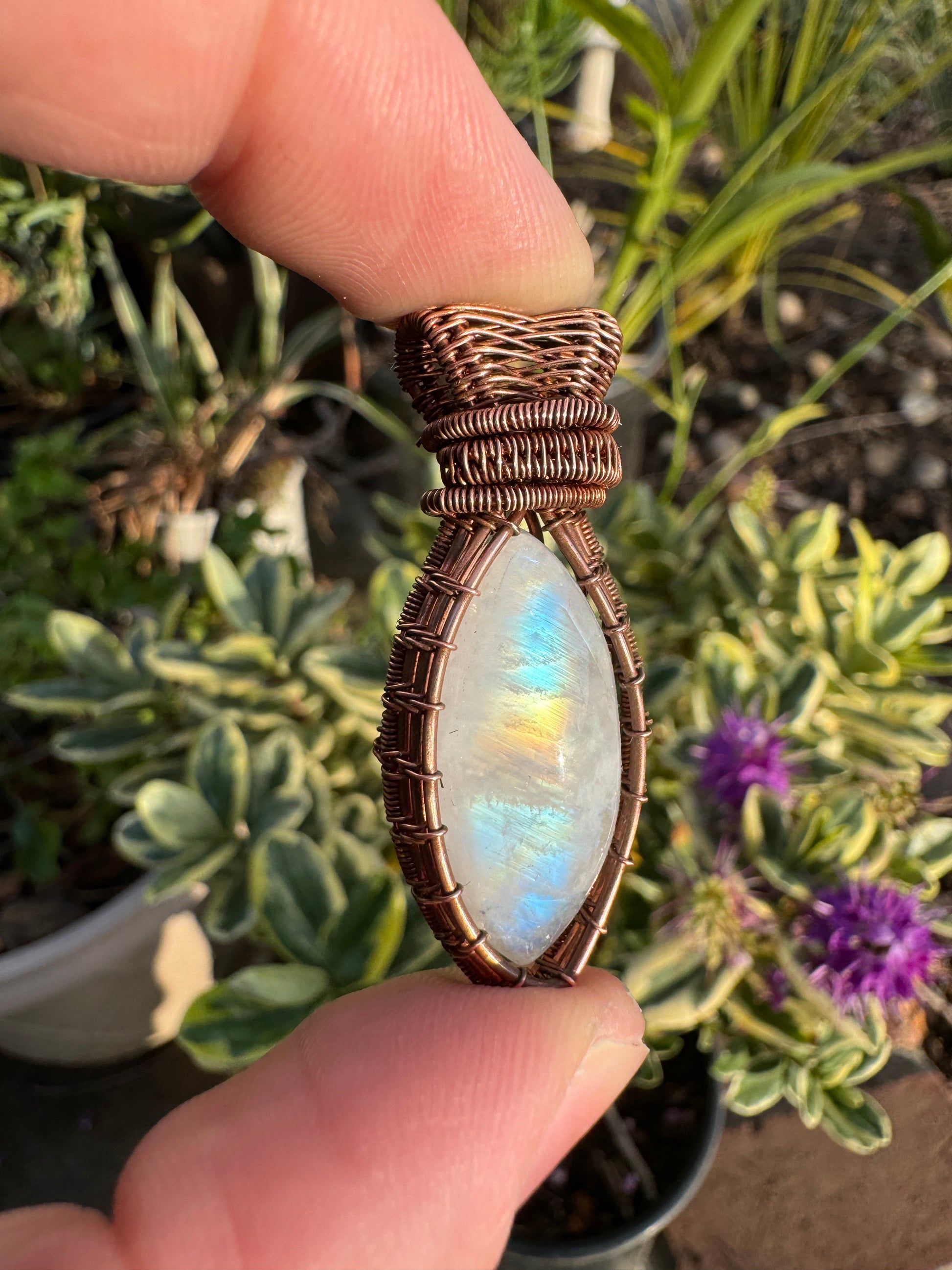 Dive into the ethereal allure of our Moonstone Magic – a celestial dance of luminescence delicately wrapped in copper, crafted into a mesmerizing pendant by the skilled hands of Or Barniv.