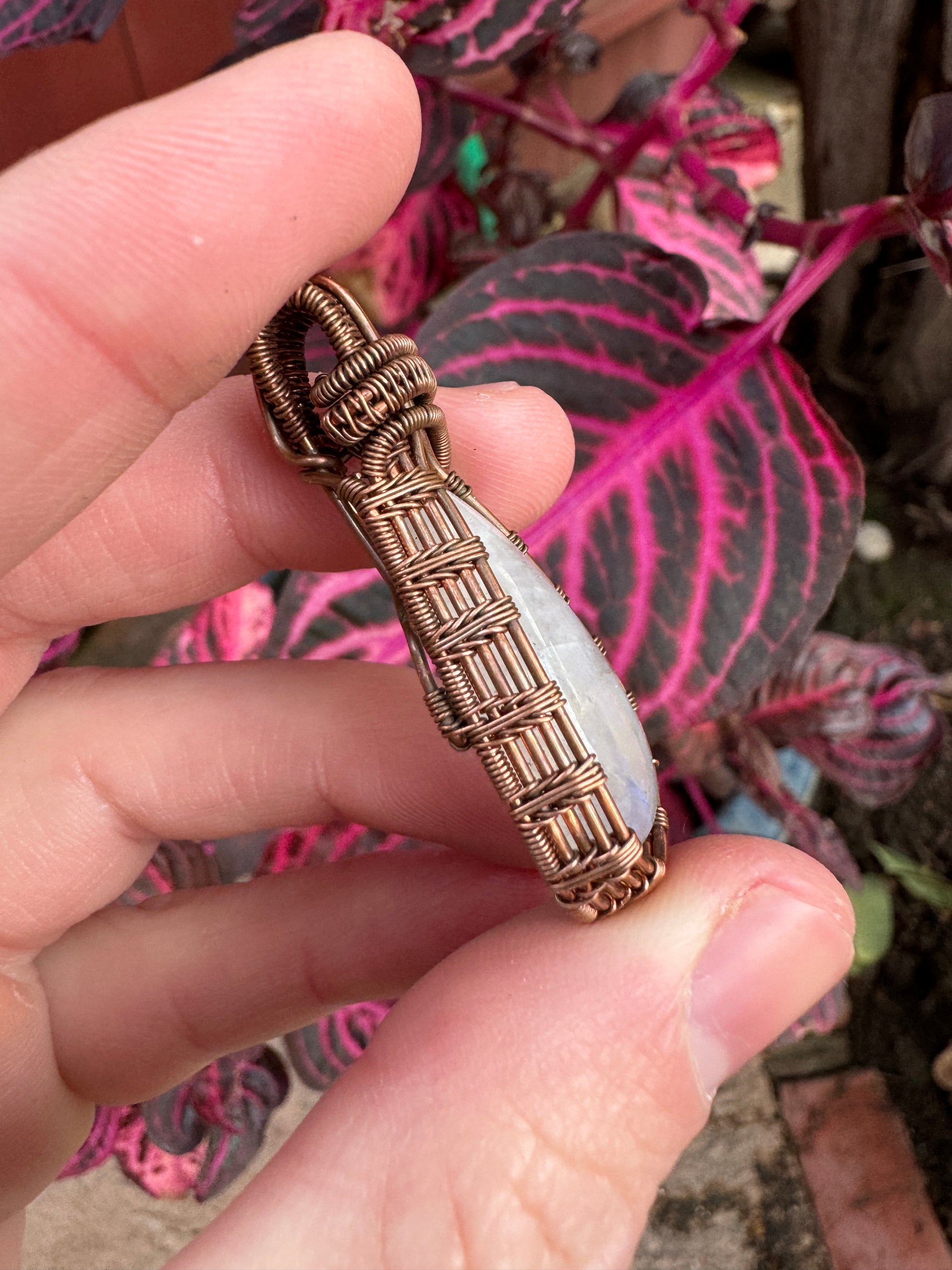 Discover the magic of the moon captured in a pendant! This unique piece encapsulates the mystical glow of moonstone, enhanced by the warm, earthy embrace of copper.