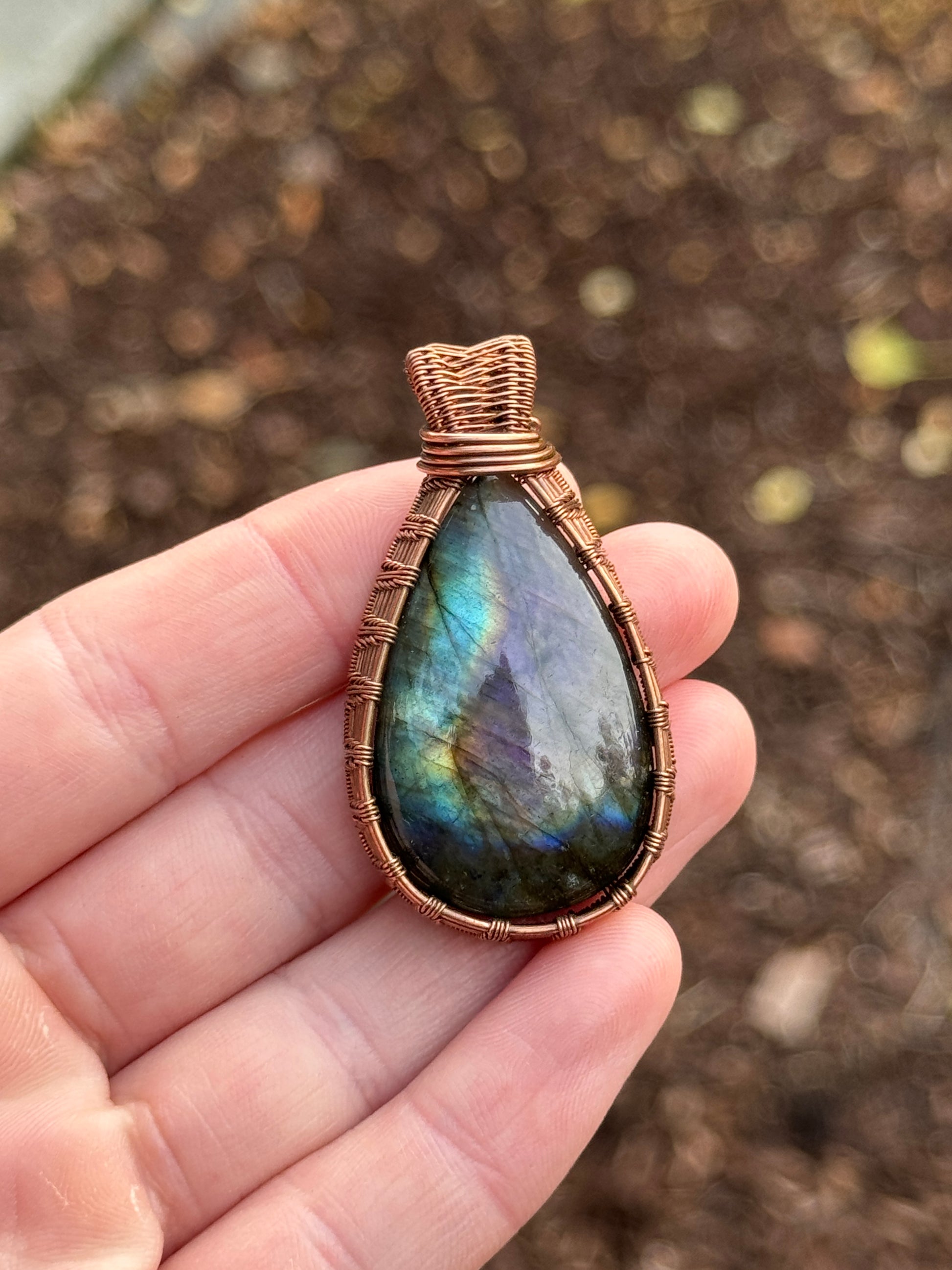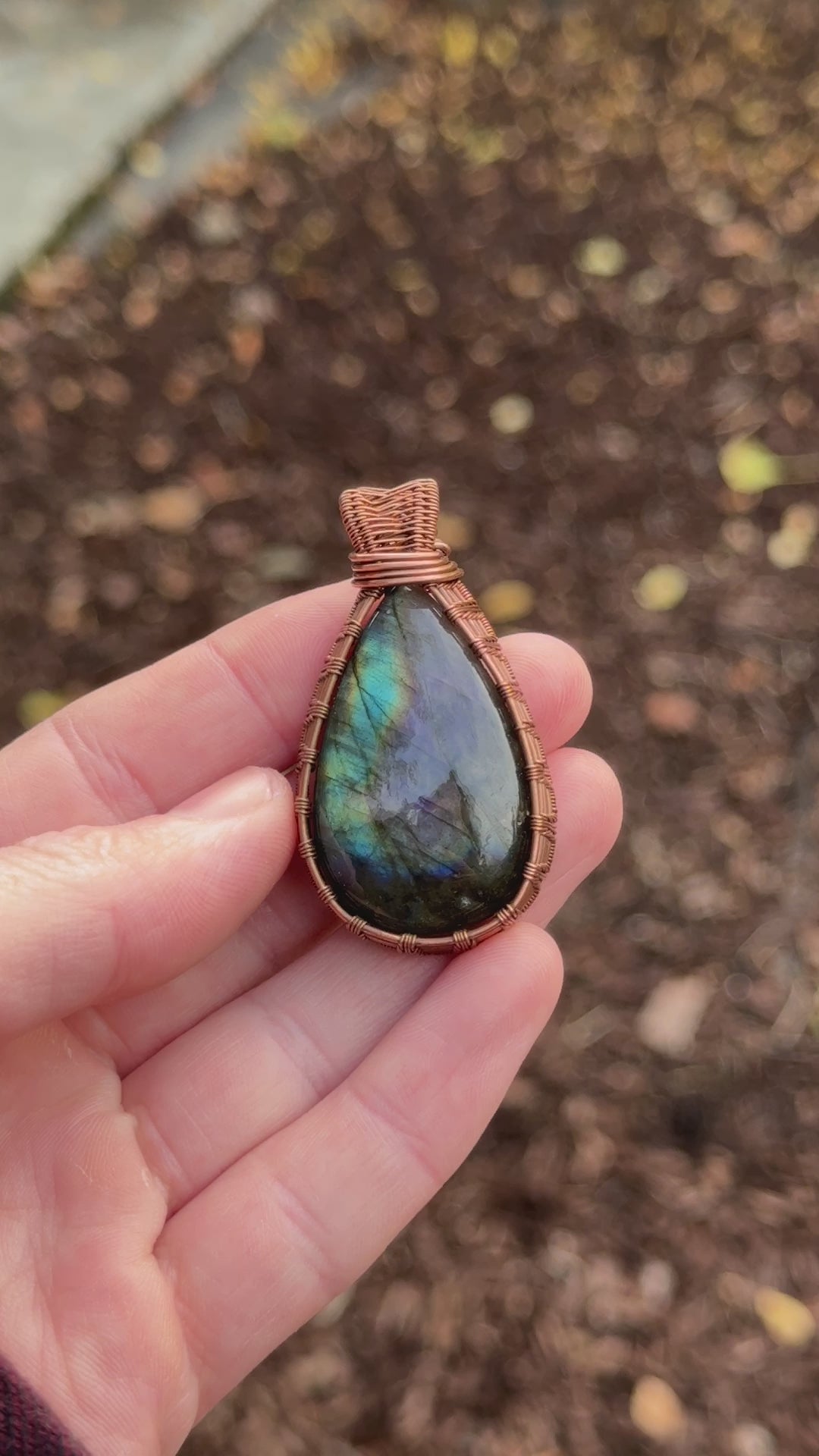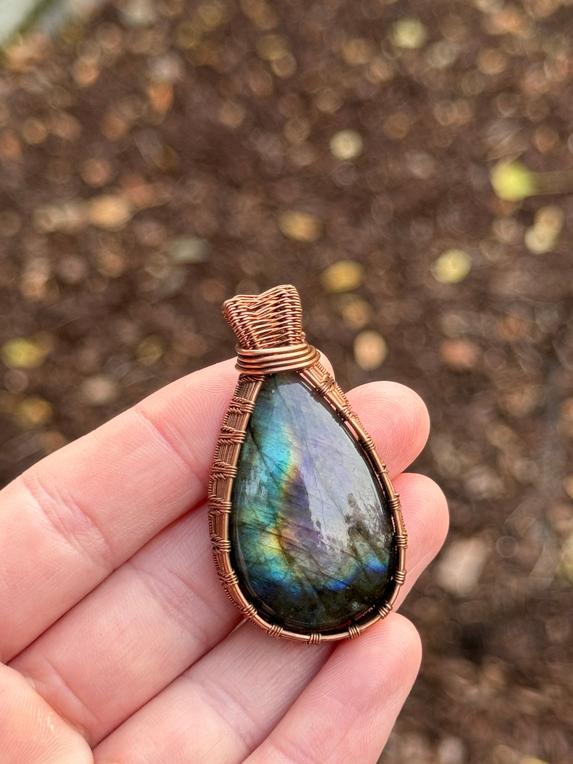 The copper wire wrapping elegantly frames the labradorite, enhancing its beauty with a simple yet organic design. Each pendant is carefully crafted to celebrate the stone’s unique character.